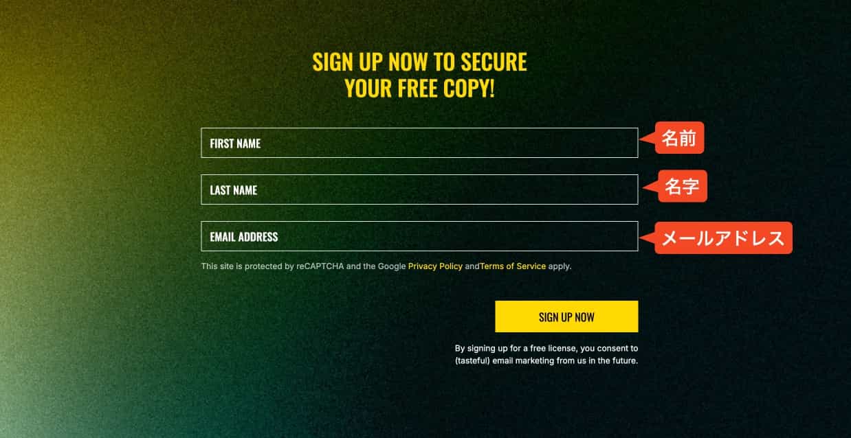 ウェブサイトにアクセスすると以下の画像の「登録ボックス」が表示されますので、名前とメールアドレスを入力して「SIGN NOW」をクリックするとライセンスがメールで届くはずです。