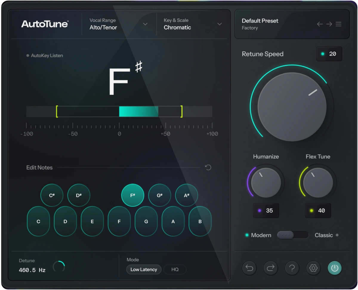 • モダンモードとクラシックモードの2つのアルゴリズムを搭載。自然な補正からAutoTune 5の象徴的なハード・チューニング効果まで幅広い音色選択が可能。