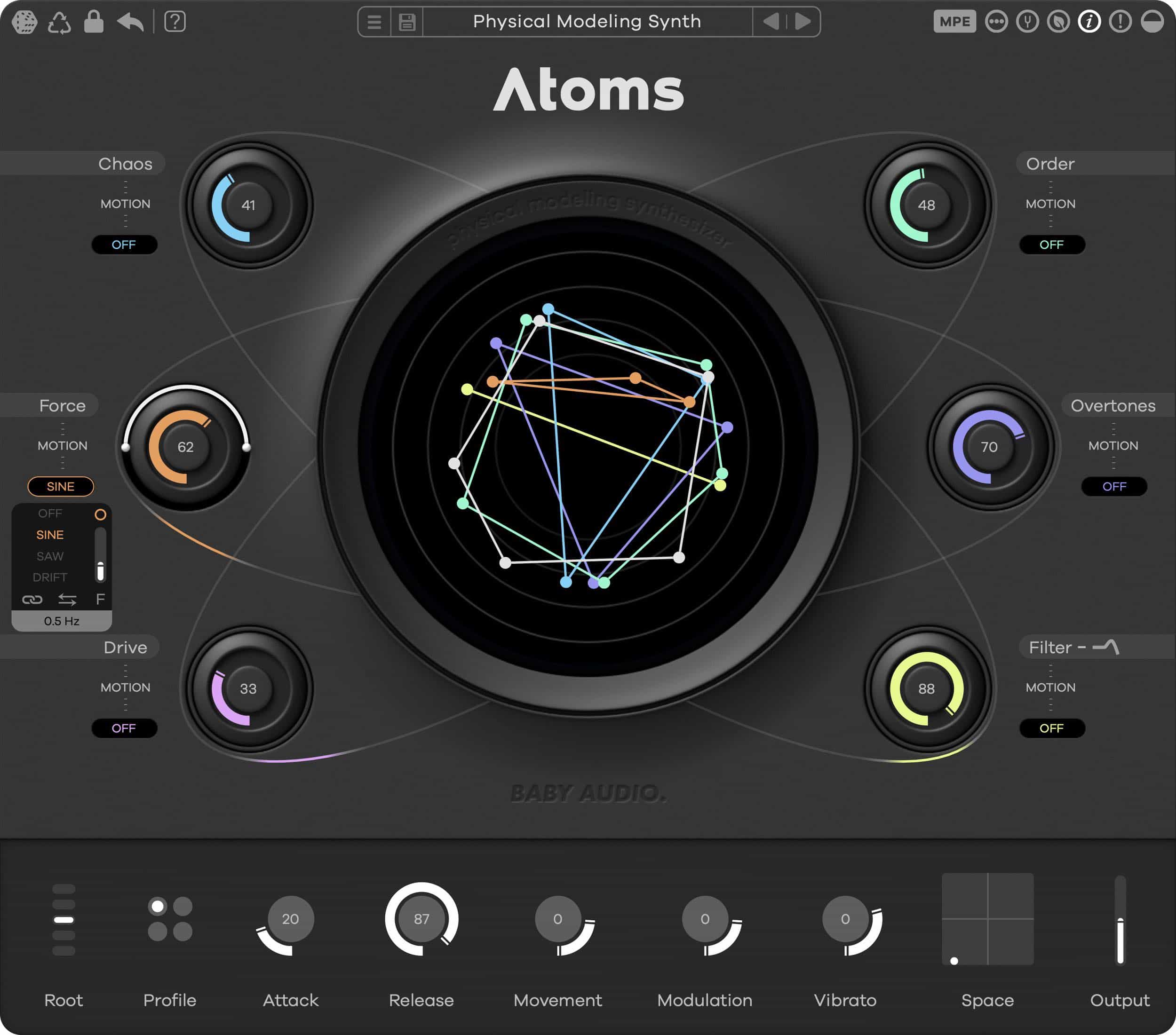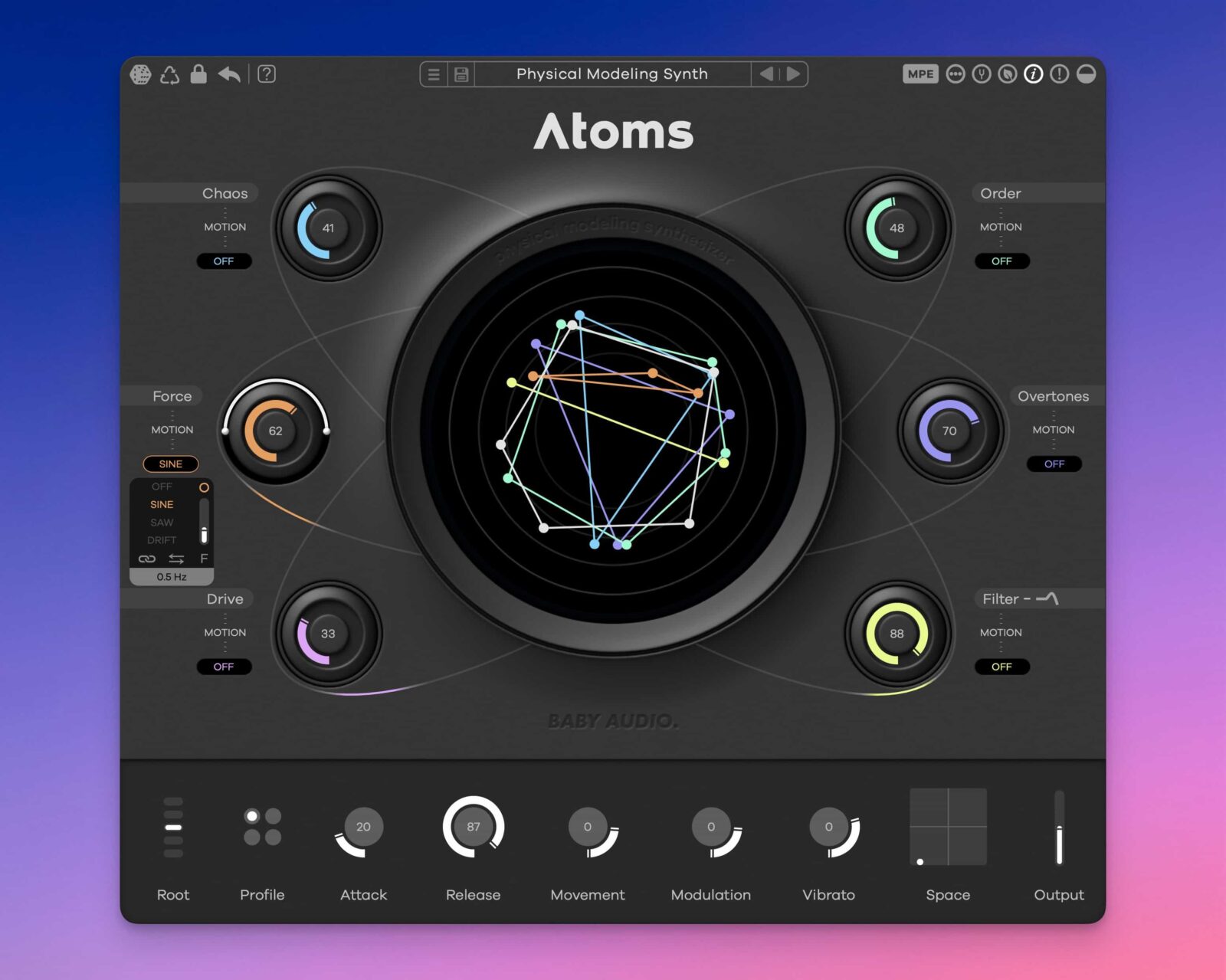 物理モデリングは現実の楽器の挙動をシミュレートしますが、Atomsは自然界の限界をはるかに超えるサウンドを実現します。