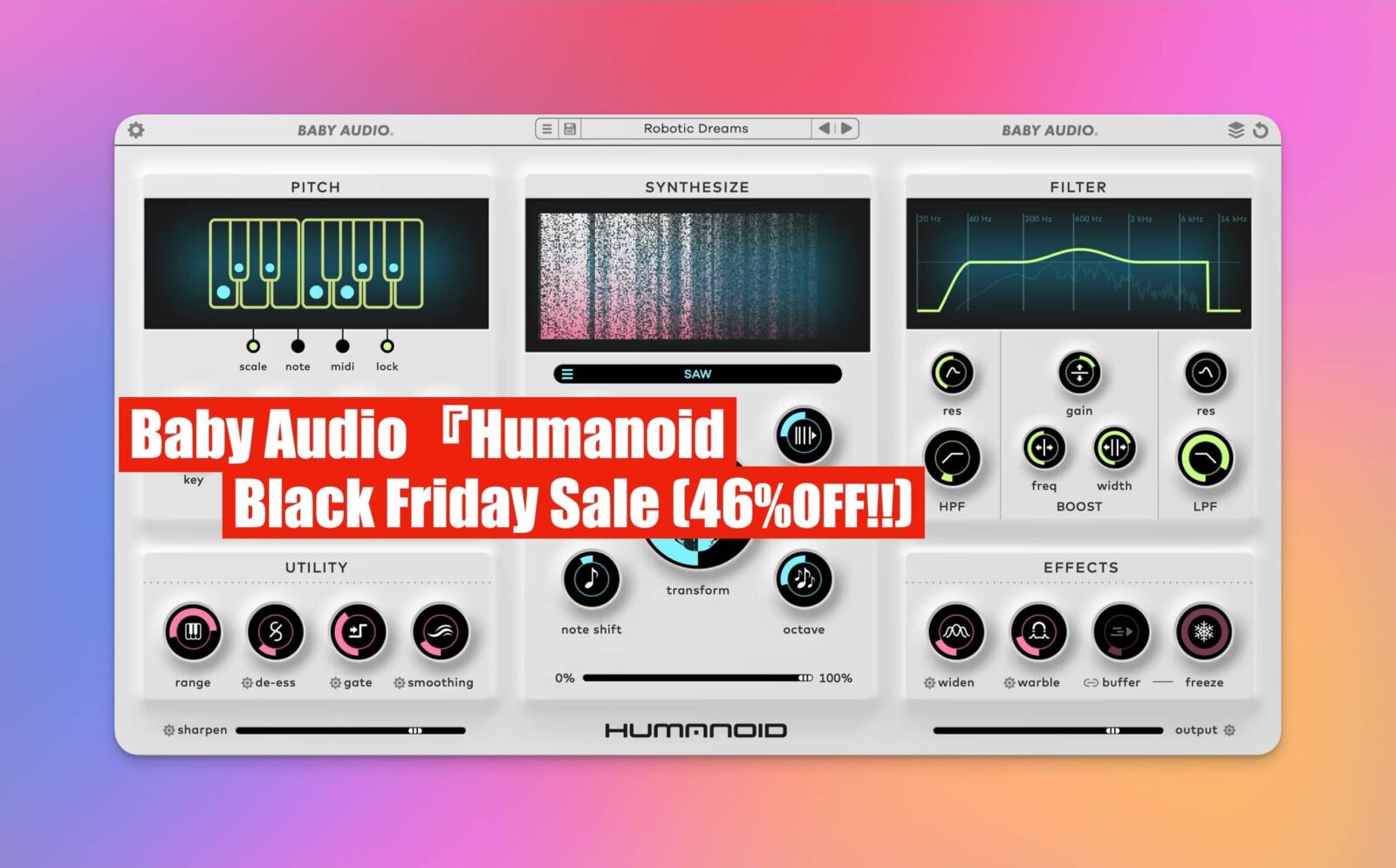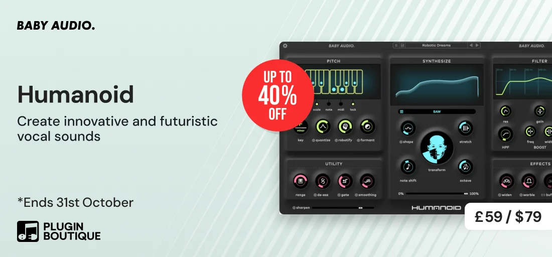 Baby Audio社から『Humanoid』(VST、AU、AAX)は、ボーカルを瞬時にロボティック&魅力的なサウンドに変身させるボーカル・プロセッシング・プラグインです。