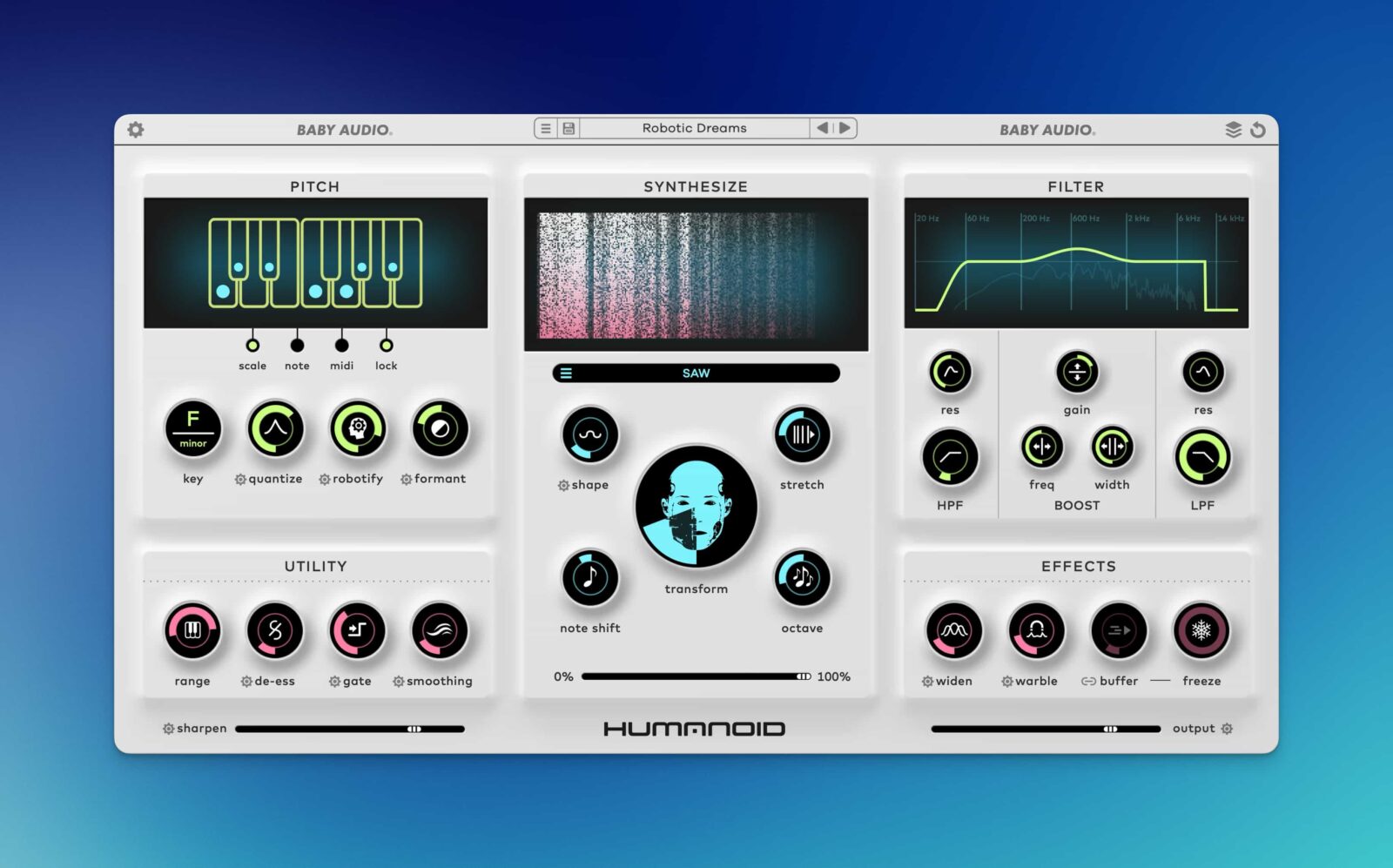 Humanoidはエクストリーム・ハード・チューニングのために設計され、革新的なボイス・マニピュレーション機能を幅広く搭載し、独特のサウンドをさらに未来へと導きます。