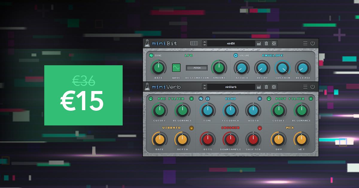 AudioThingのレトロ系ゲームサウンド作成プラグイン「The 8bit」シリーズの『miniBit』と『miniVerb』のバンドルがセールになっています。