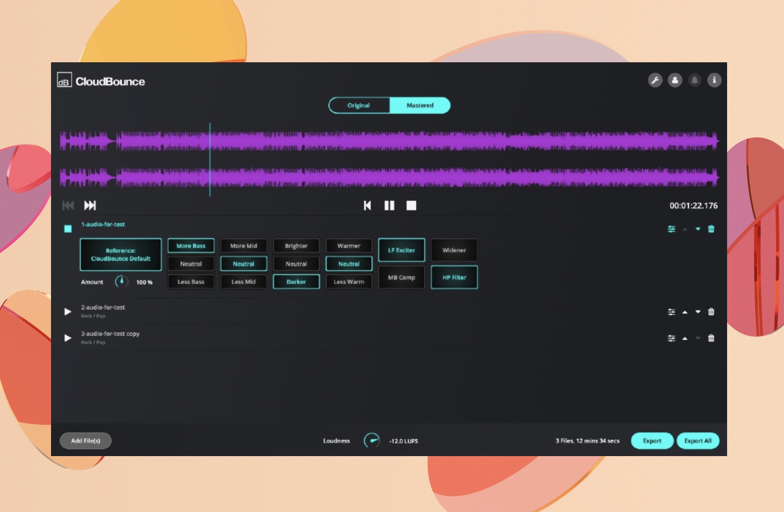 CloudBounceにファイルをドロップすると、マスタリングエンジンがファイルを分析し、適切な量の様々なオーディオ処理成分を適用して、パワフルでクリアなサウンドにしてくれます。