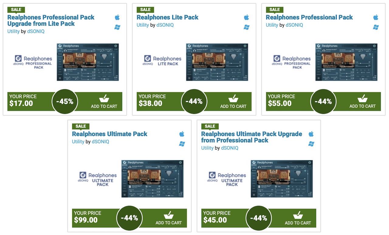 また、中位版の『Realphones Professional Pack』なら、通常価格:99ドル → セール特価:65ドルで購入できます。