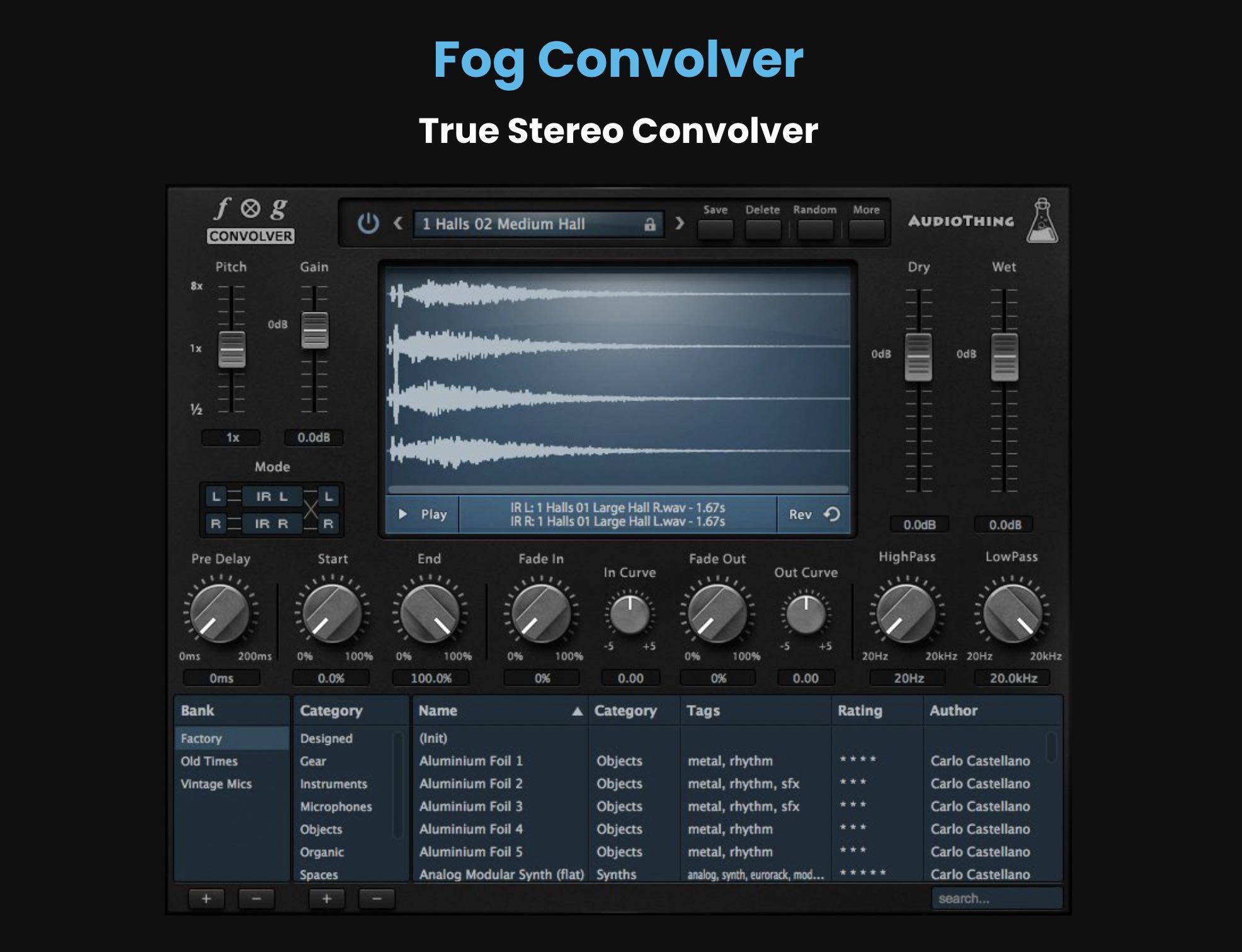 新しくなった新バージョン「Fog Convolver 2」では、空間、アナログとデジタル機器、オーガニックソースなどから作られた660以上のインパルスレスポンスを持つ8つのファクトリーバンクを搭載しています。