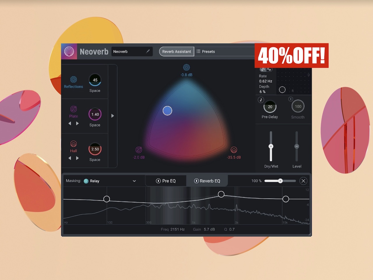 余計な作業時間や試行錯誤を取り除き、ミックスを混乱させることなく、ボーカルや楽器のためのユニークなスペースを数秒でデザインすることができる画期的なリバーブプラグインです。