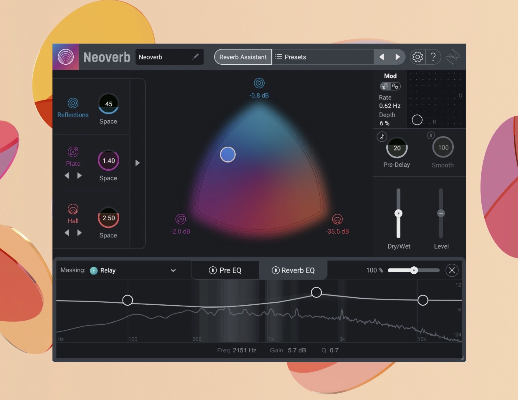 SmoothコントロールでNeoverbに入力されるオーディオのトランジェントを柔らかくしてリバーブのサウンドを均一に保ち、Pre-Delayをコントロールして深みや距離感を加え、Dry/WetとLevelスライダーで自然なブレンドを作成することができます。