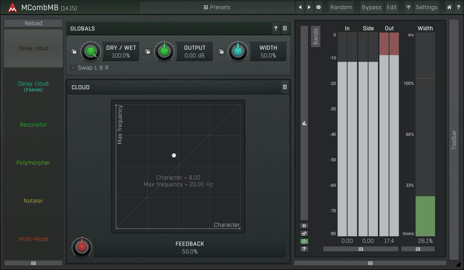 MCombMBは、独創的なサウンド制作を求めるプロデューサーのために設計された、用途の広いマルチコムフィルターです。スマートな「ランダムエンジン」を搭載していることで、上質な風合いのサウンド、リズミカルなパッド、躍動するドラムループを簡単に制作することが出来ます。