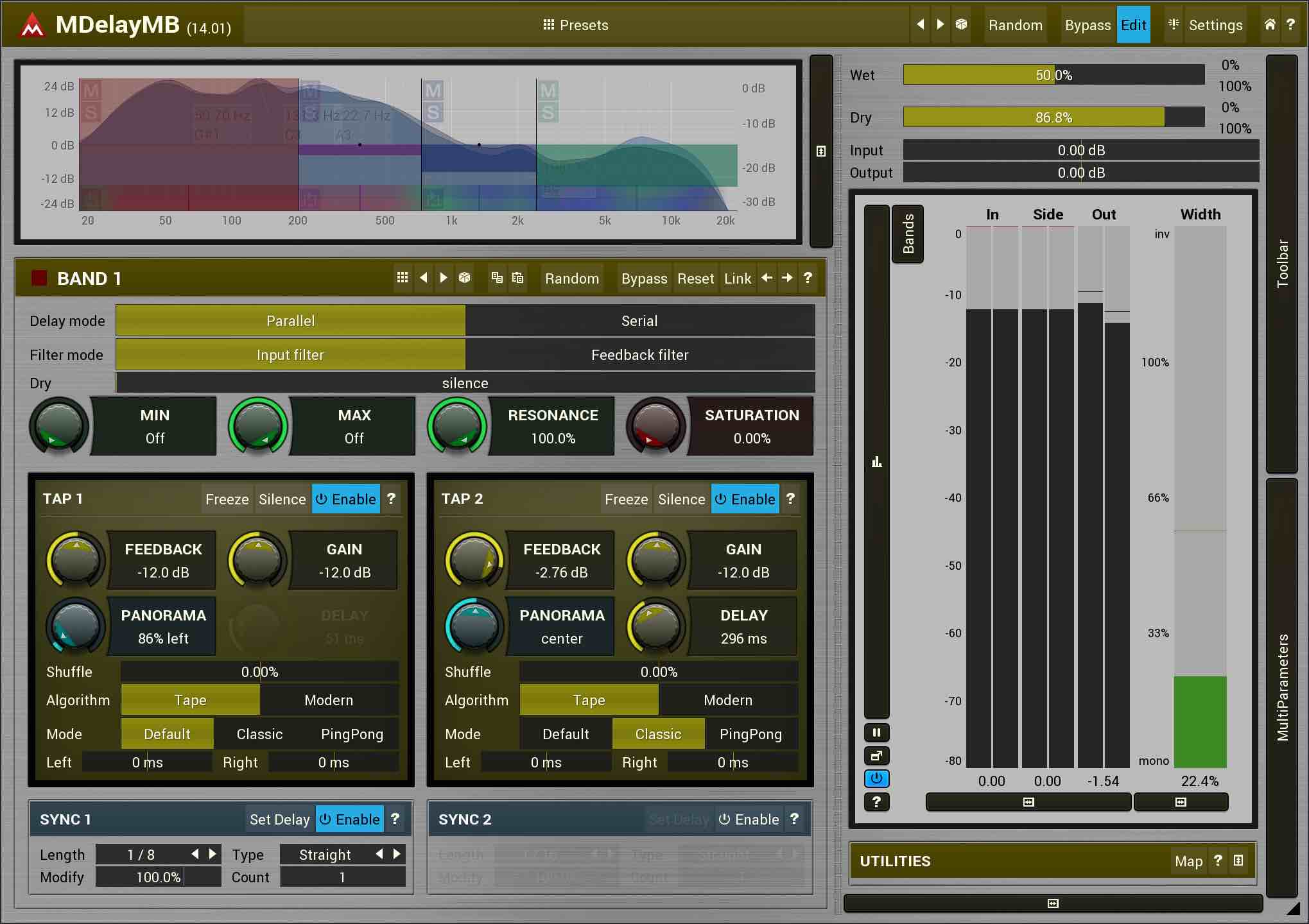 バンドごとに2つの同期可能なタップを搭載し、それぞれに3つの異なるディレイ・アルゴリズムを搭載しています。