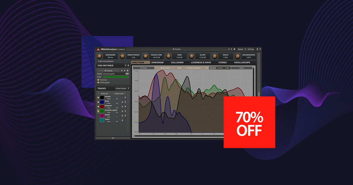 MMultiAnalyzerは、ユニークなマルチトラック・アナライザーとソノグラム絵を搭載しています。
