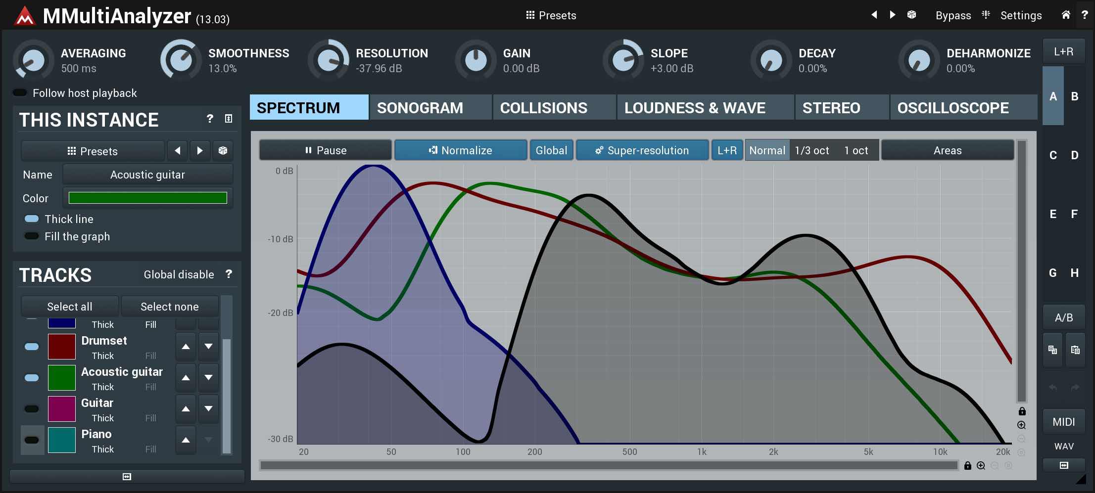 MMultiAnalyzerの便利な機能として、下の画像のように「スペクトラムモード」と「コリジョンモード」を使用して、トラック同士の音のかぶりを視覚的に確認することができます。