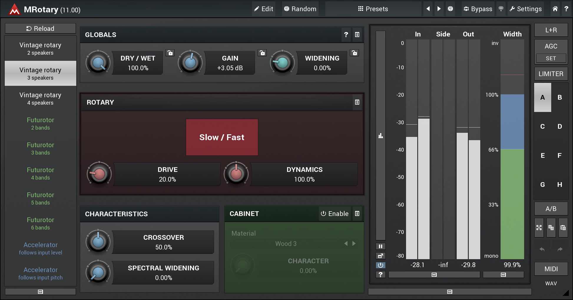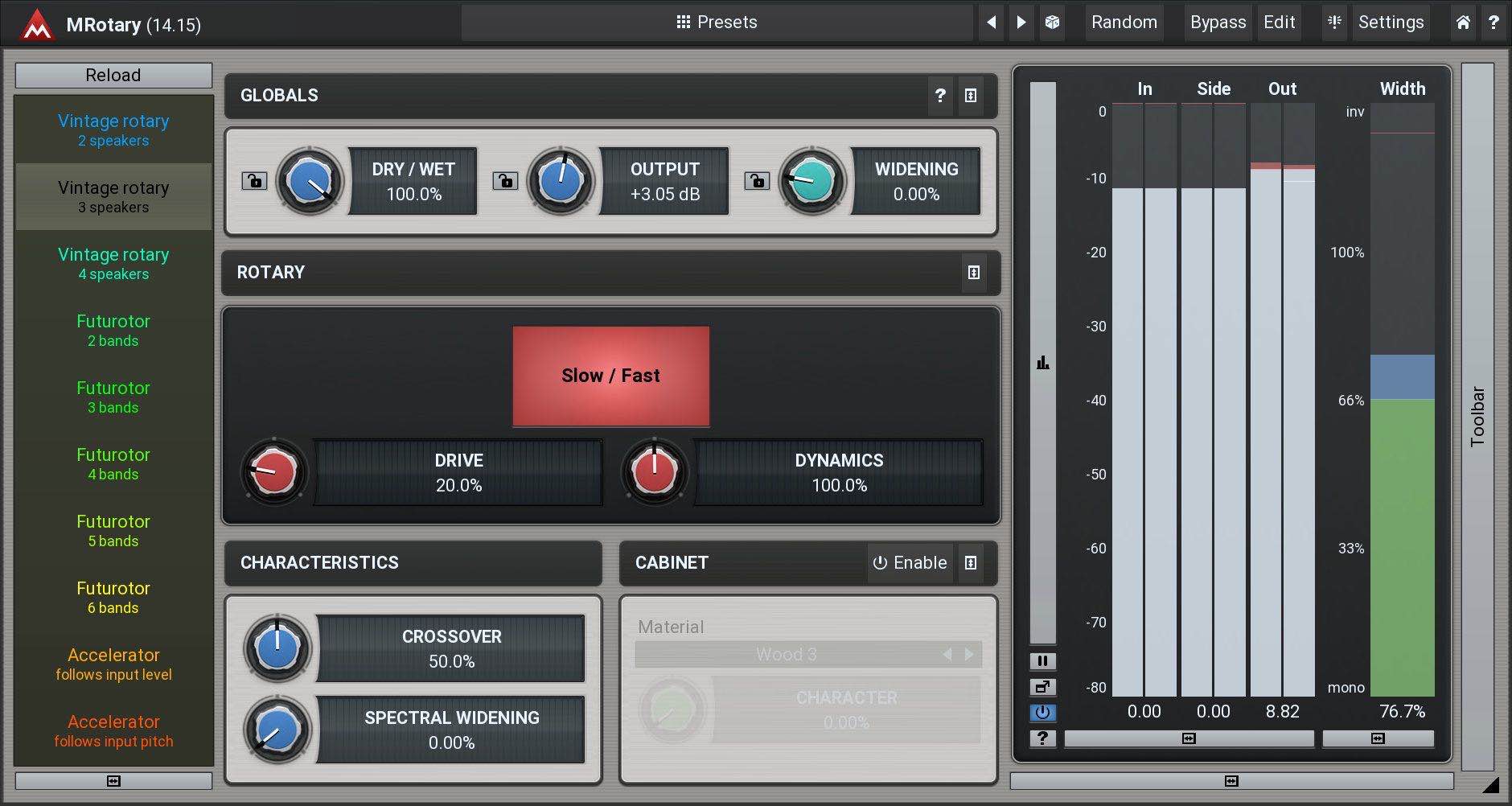 MeldaProduction『MRotary』は、キャビネットアンプシミュレーター(ロータリースピーカー・キャビネット・シミュレーター)です。