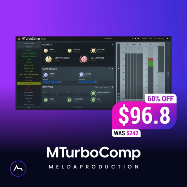 数あるコンプレッサープラグインの中でもモンスター級の機能を誇るMeldaproduction「MTurboComp」。