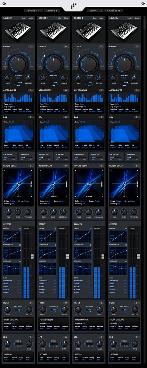 各音源のサウンドとFX設定を変更する幅広い可能性を備えたミキサー。