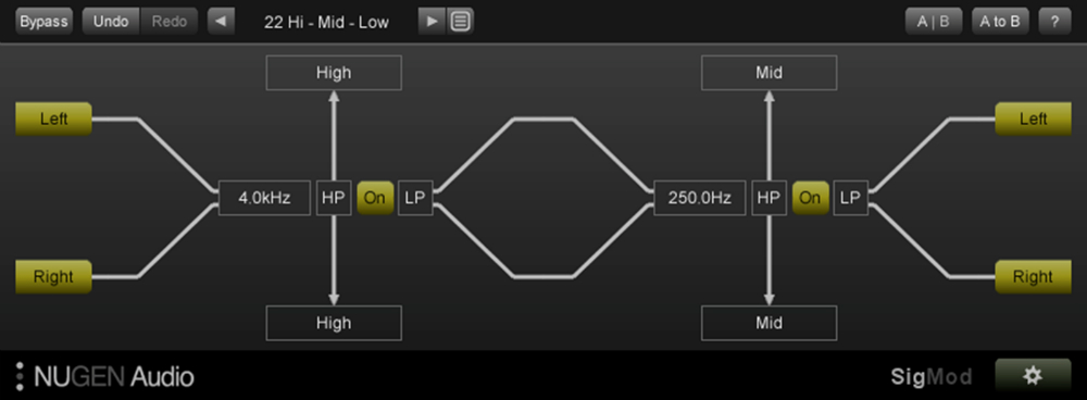 クロスオーバーモジュールを使って、高域と低域を分割して、異なる周波数帯域に異なるエフェクトをかけることができます。