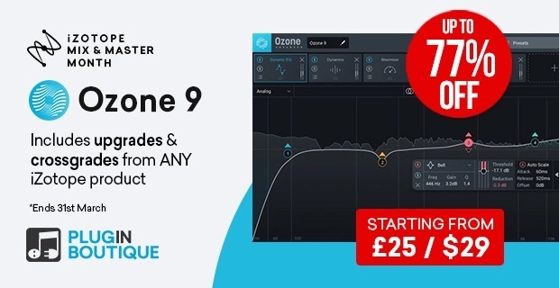 iZotopeの総合マスタリングツール『Ozone 9』のクロスグレード版が最大で70%OFFのセールになっています。