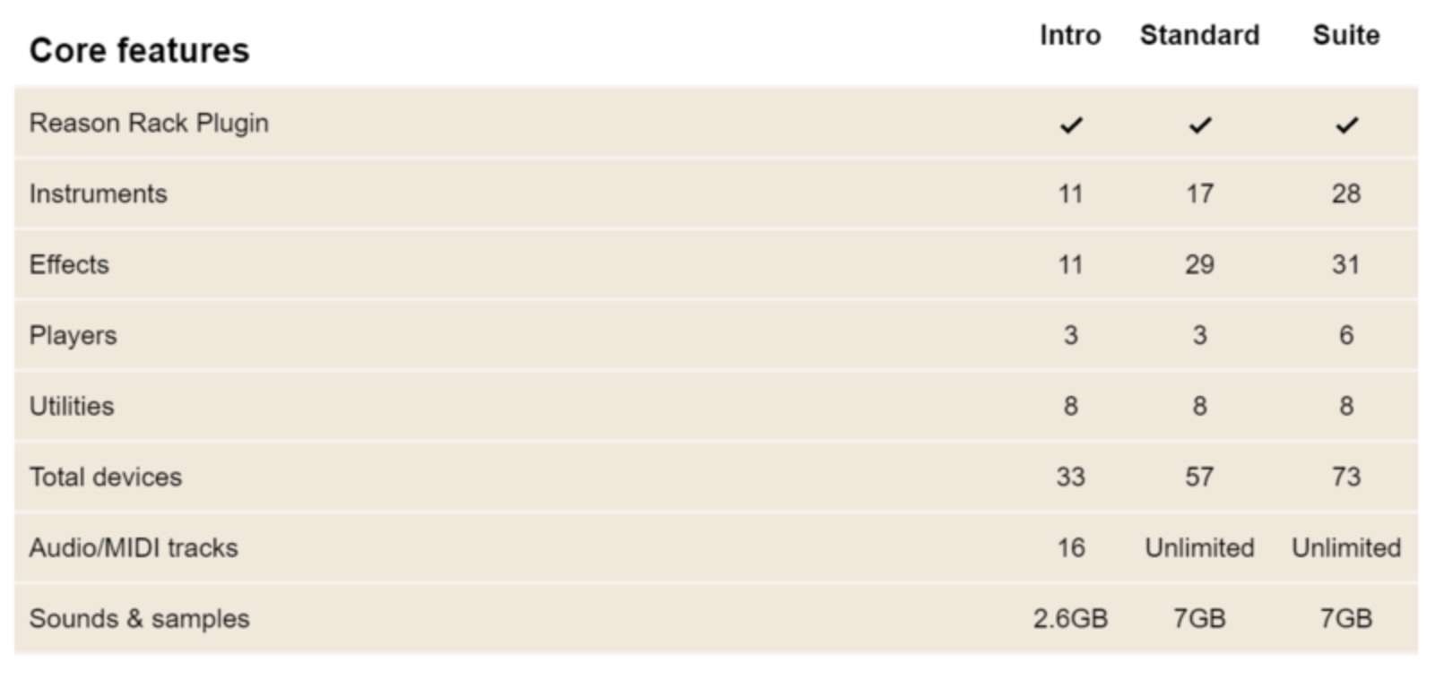Reason Suite(現在はReason+としてのみ提供)は、計70台以上のデバイス、エフェクト、その他の音楽作成ツールの膨大なコレクションを擁しています。