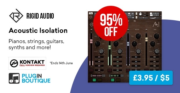 Rigid Audioの KONTAKT専用音源『Acoustic Isolation』。95%OFFになっています(通常価格:89ドル → セール特価:6ドル)。