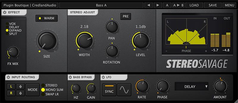 ステレオ幅のコントロール、パンニング、ローテーション、モノラル音源からステレオを生成する4つのエフェクト、入力ルーティングコントロール、ベースバイパスとモノラルベースコントロールなどの機能を備えています。