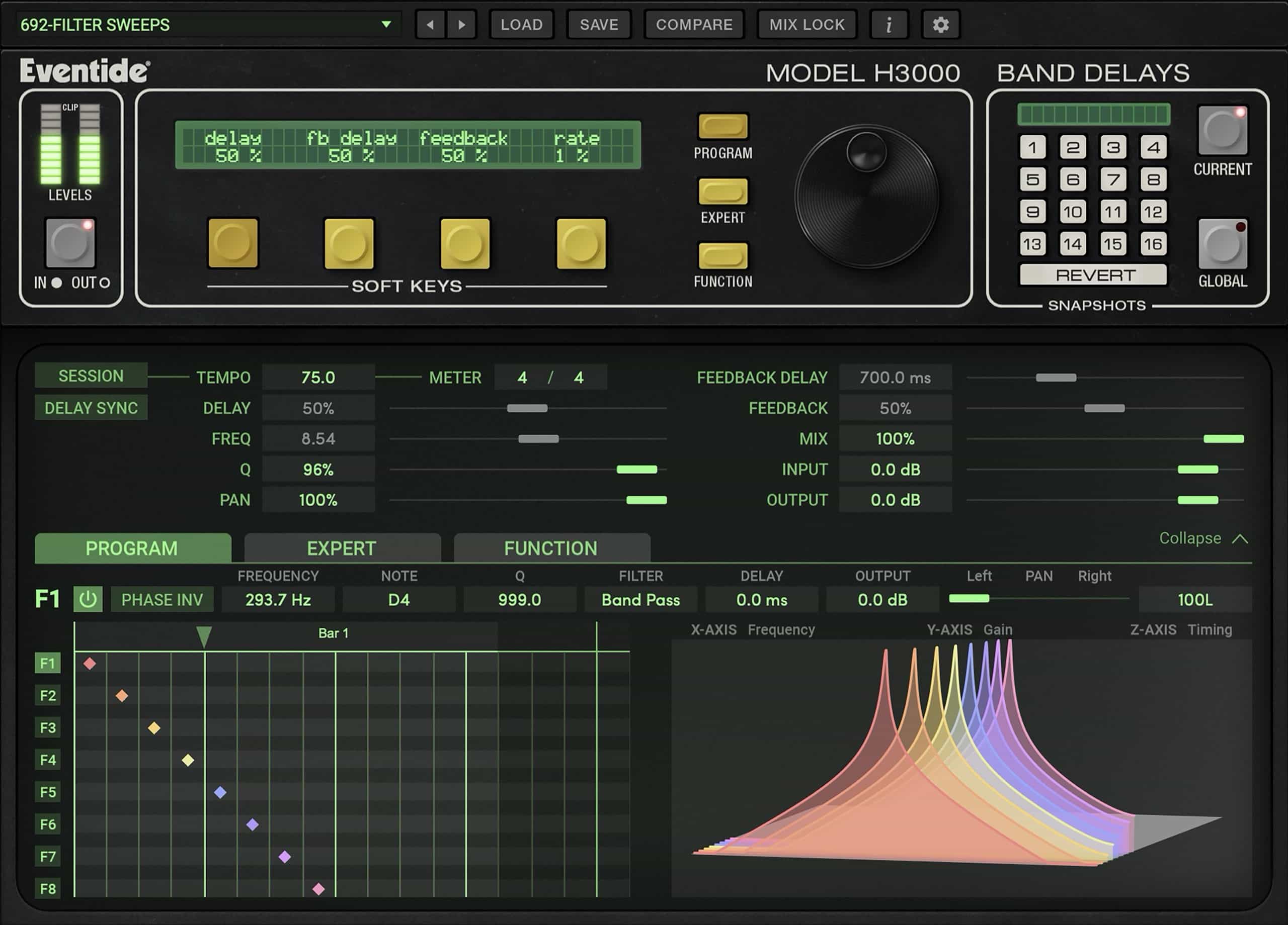 H3000 Band Delays Mk IIは、レベル、パン、フィルタータイプ、周波数、Qをそれぞれ個別にコントロールできる8つのディレイバンドを備えています。