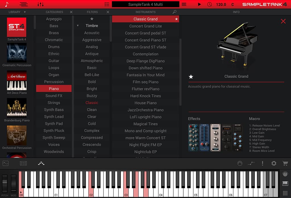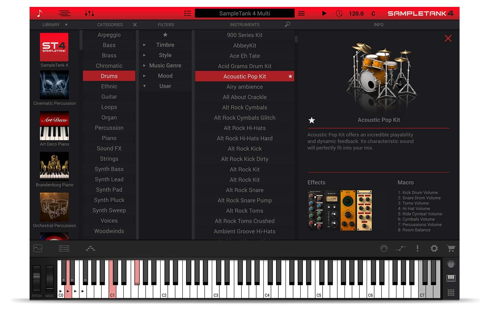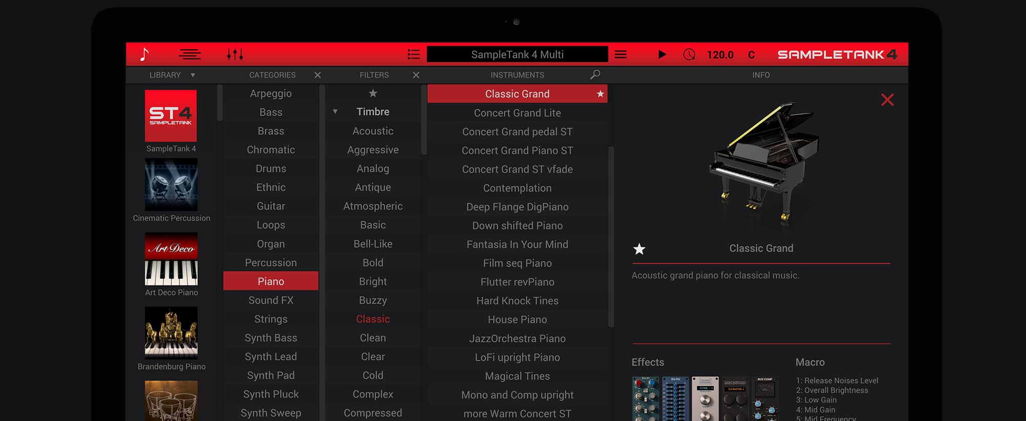 SampleTank 4は、100 GB、数千のインストゥルメントプリセットを備えた巨大サウンドライブラリを提供し、幅広いスタイル、ジャンル、サウンドに均等にバランスを取っています。
