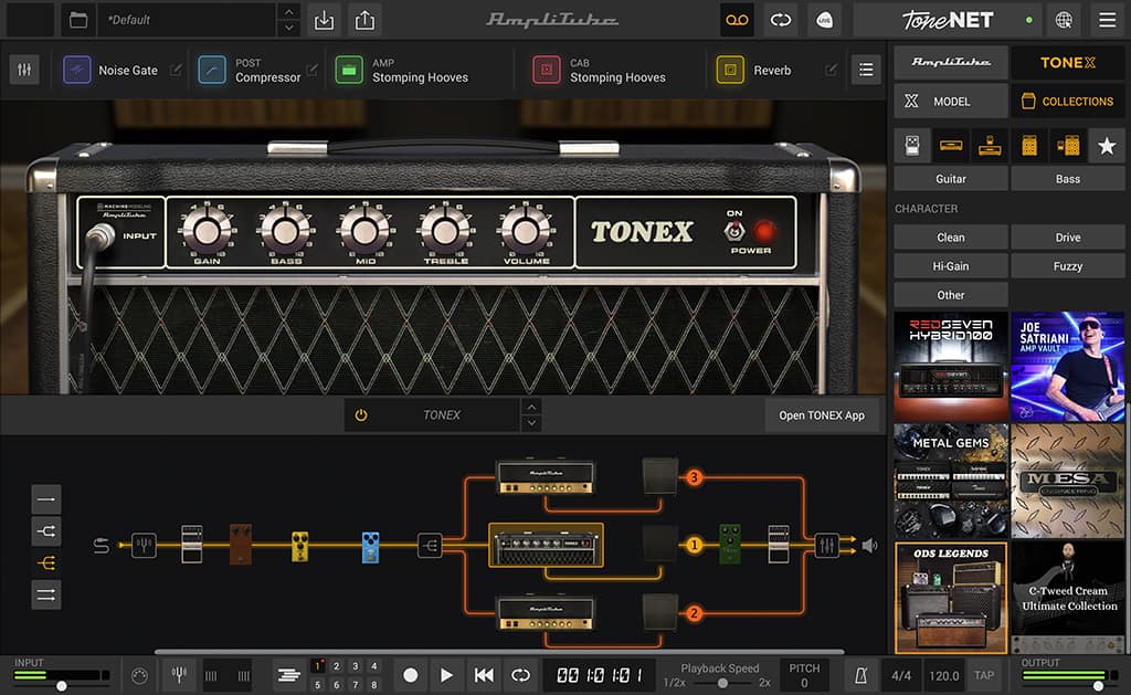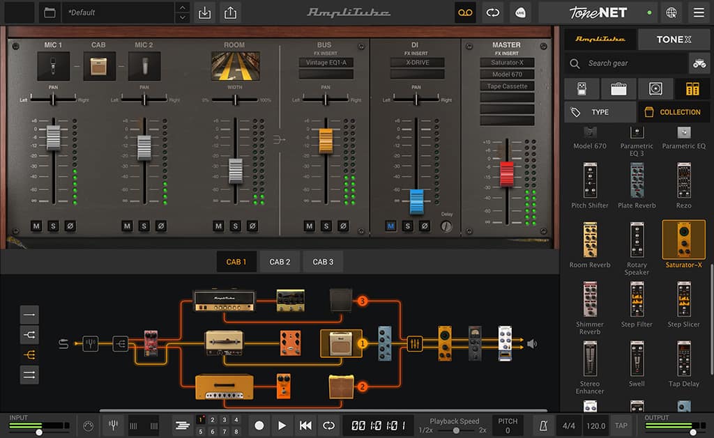 ステムス、アンプ、キャビネット、スピーカー、マイク、ルーム、ラック FX がすべて 1 つのインターフェースに集約され、好きなようにルーティングできます。
