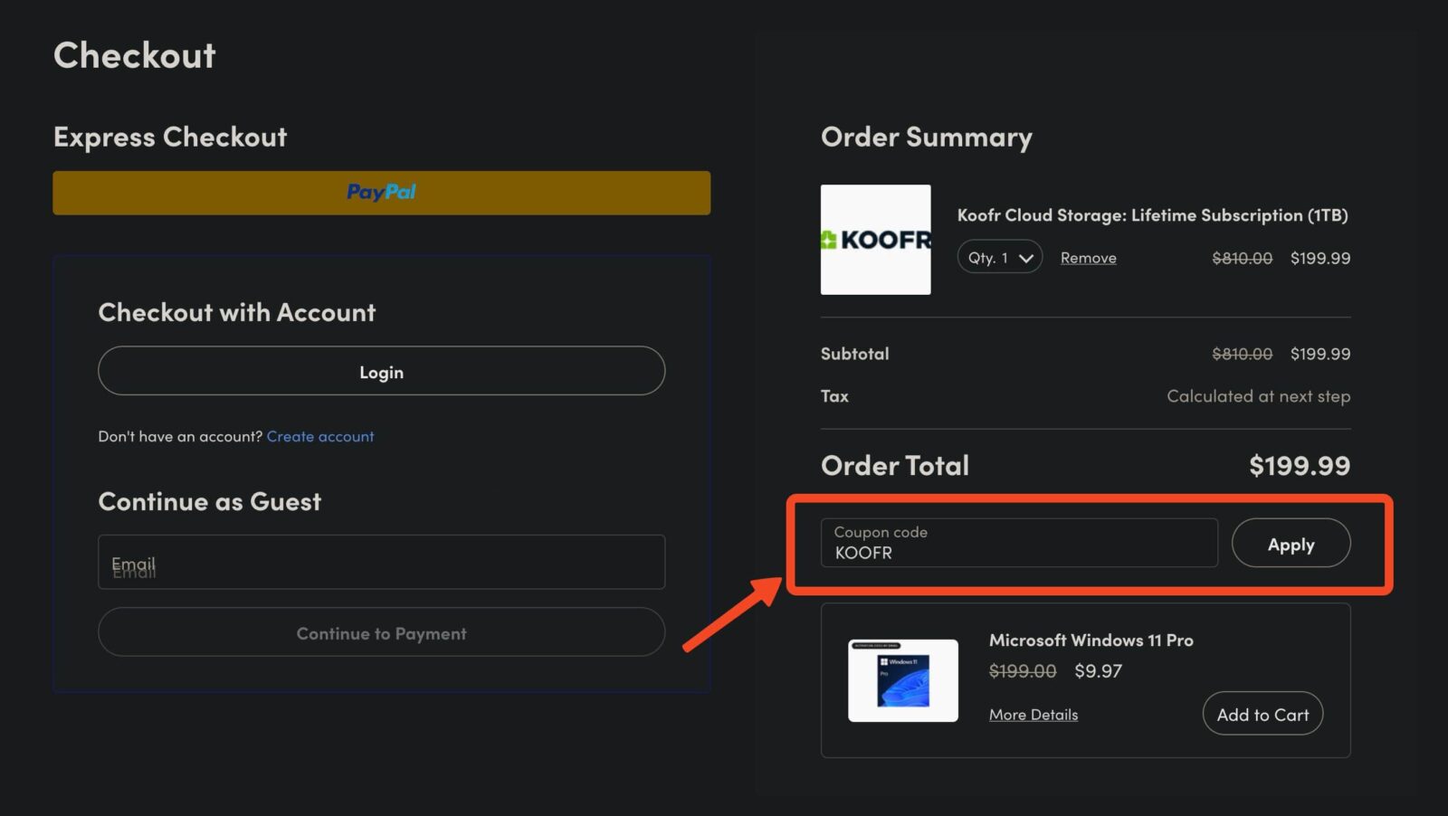 - Coupon codeの枠にクーポンコードの「KOOFR」を記入し「Applyボタン」をクリックします(以下の画像)。