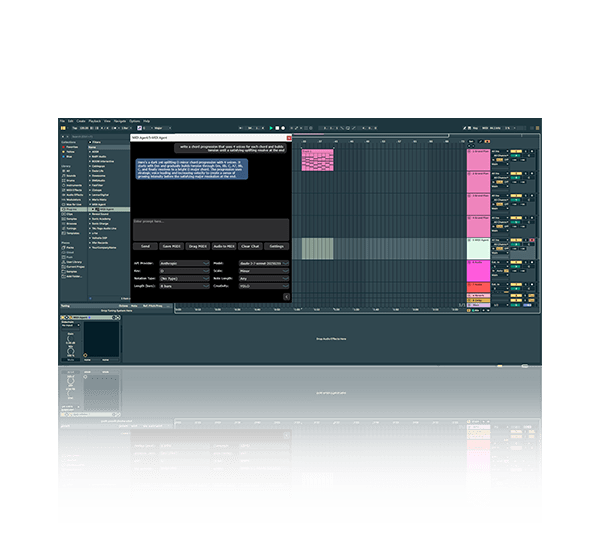 ChatGPTやClaudeなどのAIモデルを使って、メロディ/コード/リズム・パターンといったMIDIアイデアを素早く生成し、制作の発想出しを助けます。