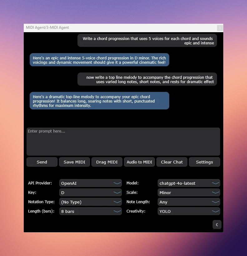- ChatGPTなどの外部APIのほか、音楽理論に特化した独自のAIモデルを利用して実用的なMIDIを作成できます。