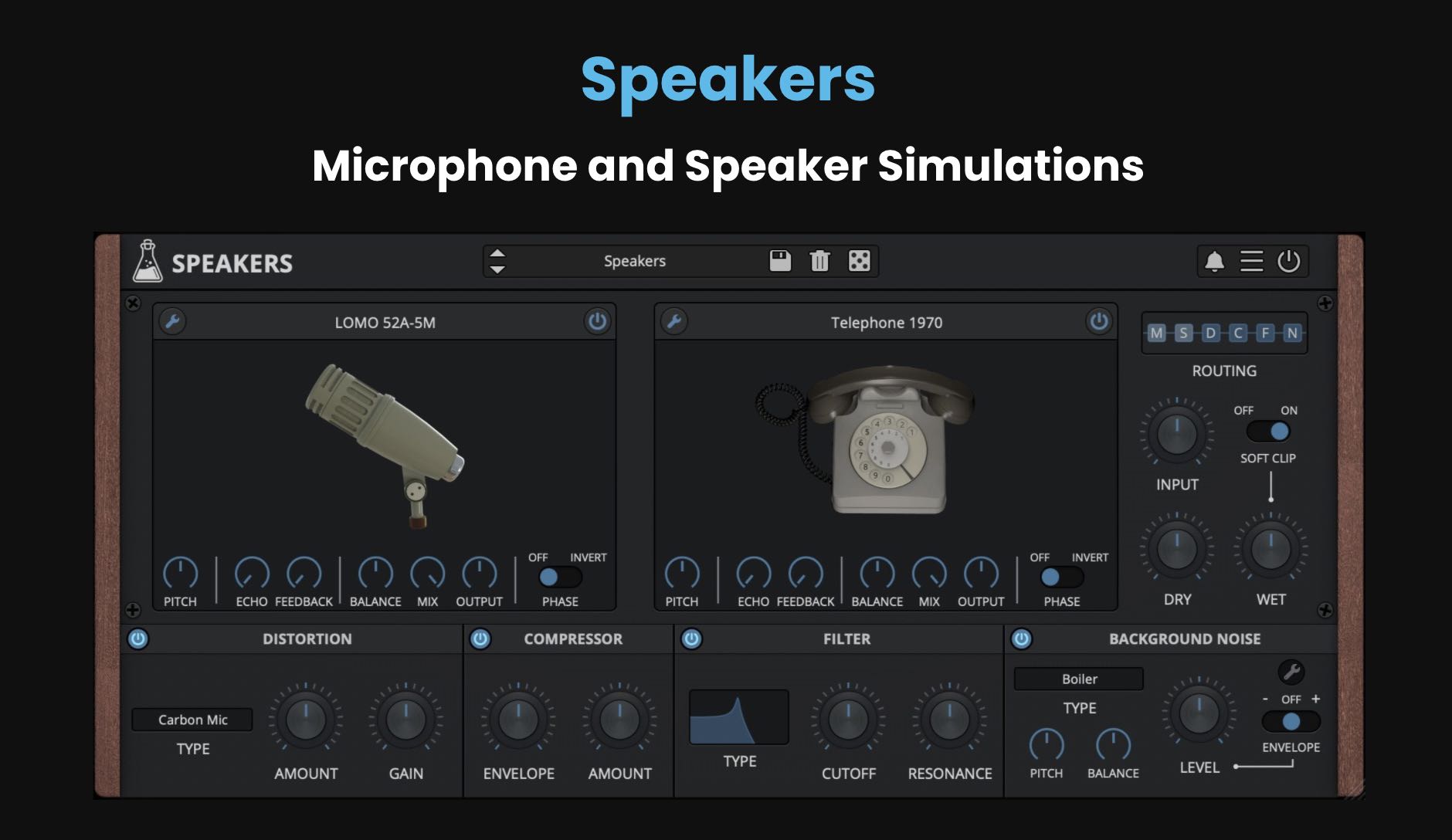 Speakersには、コンプレッション、ディストーション、フィルタリングからなる自由に設定可能なエフェクトチェーンと、さまざまな環境でサウンドを設定するためのループするバックグラウンドノイズが用意されています。