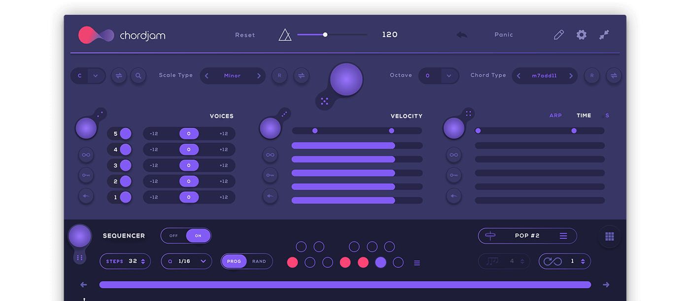 Chordjamは、ユーザーが直感的に操作できるランダム処理によってコードや進行パターンを構築してくれる革新的なプラグインです。