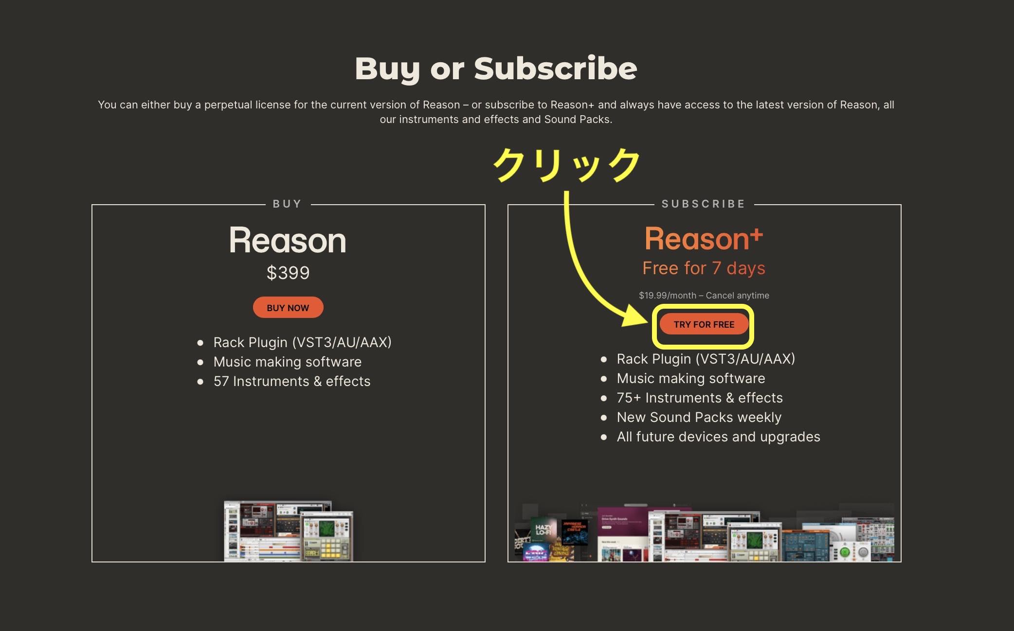 Reason Suiteは買い切りの製品でしたが、このReason+はサブスクリプション(1年単位の契約)のみ提供に変更されています。
