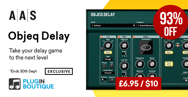 AASのディレイFX『Objeq Delay』が10ドル(通常価格:139ドル)のセールになっています。使うのが使っていて楽しいディレイです。