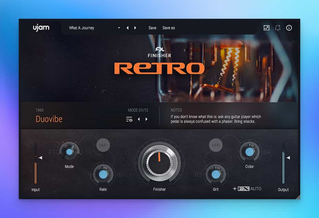 その願いを叶えるため、UJAMのサウンドエキスパート陣があの時代のリバーブ、ディレイ、フランジャー、テープのヒス、チューブサウンドなどを徹底的に研究してFinisher RETROを開発しました。