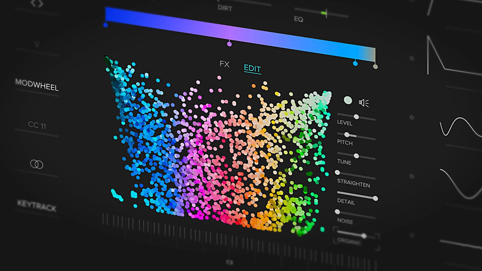 - ノイズ・パラメーターは、選択されたサウンド・カラーに特別にチューニングされた「音楽的なノイズ」を追加します。