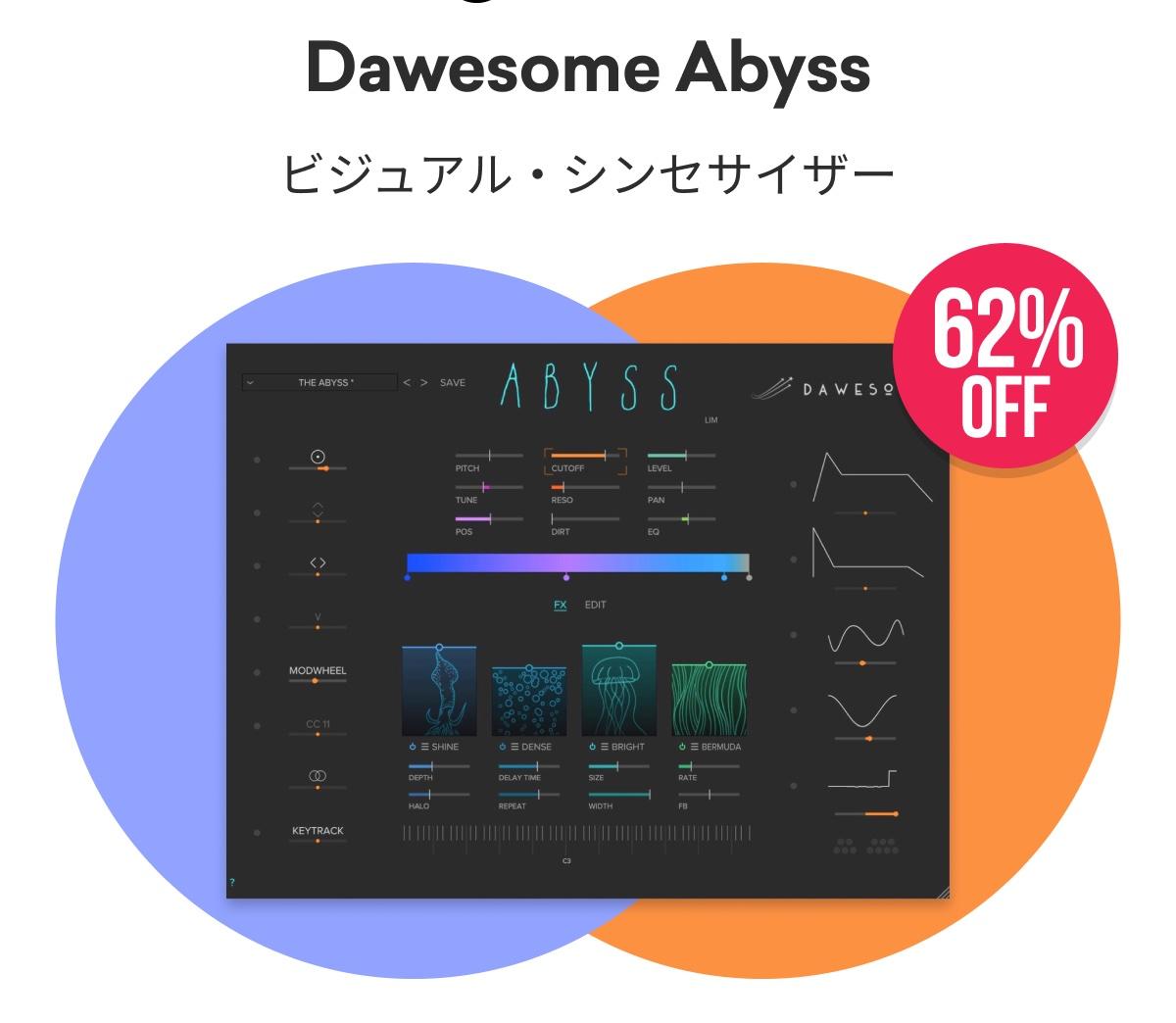 Abyssは、シンセ・サウンドの創造に新しいビジュアル・アプローチを採用し、エキサイティングなサウンドを実現したシンセサイザー・プラグインです。