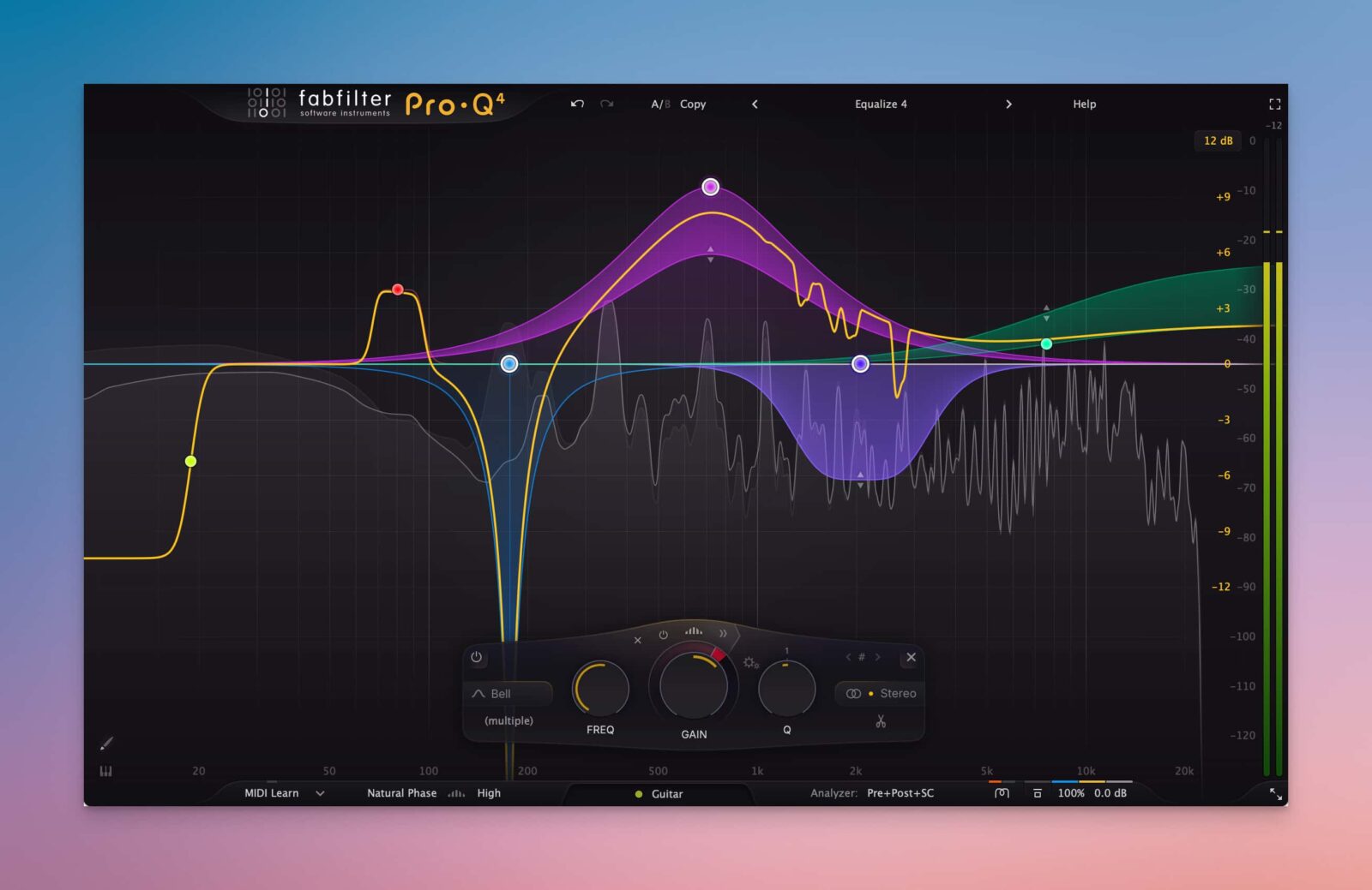 Pro-Q 4には、要求の厳しいエンジニアが望むすべてが揃っています:ゼロレイテンシーと独自のナチュラルフェーズモードに加えた最高品質のリニアフェーズ動作、スムーズなダイナミックEQ、バンド単位のミッド/サイド処理、フルサラウンドサポート(Dolby Atmos 9.1.6まで)、インテリジェントソロ機能、オプションのオートゲイン、組み込みのカスタマイズ可能なスペクトラムアナライザーです。