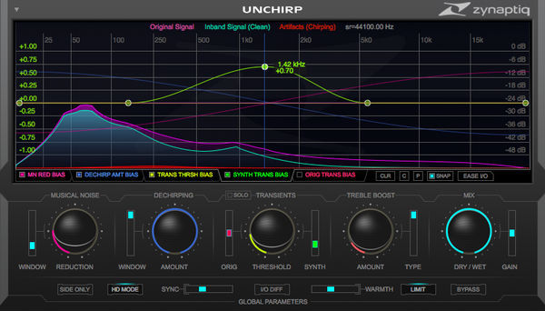 音楽的なノイズの低減、高周波のチャープ(水中音、ワーブリング、ツイーターとしても知られる)の抑制、トランジェント・スミアの修正、失われた高域の復元など、UNCHIRPはすべてを一度に行います。