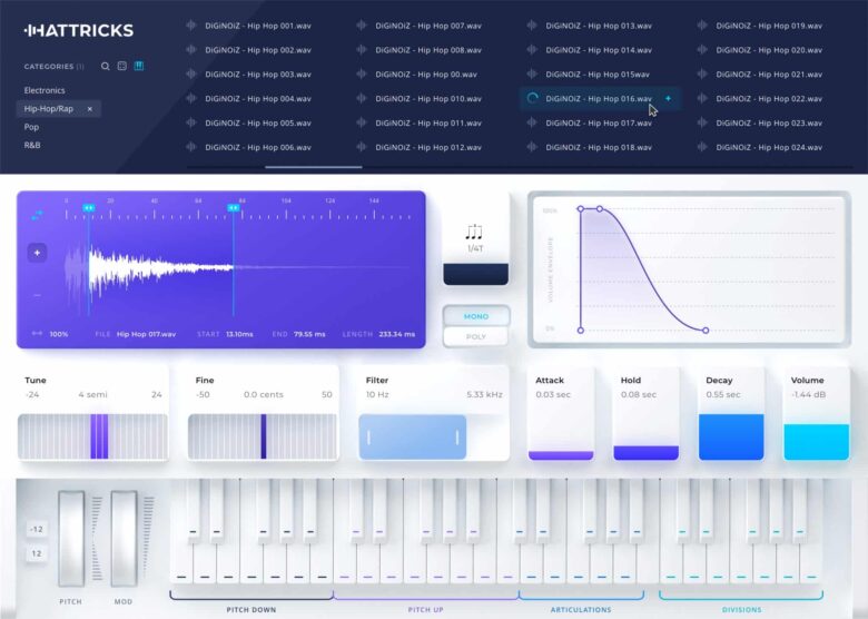 Diginoizの『Hattricks』。ヒップホップ&トラップのハイハット制作に特化した最新バーチャルインストゥルメント・プラグインです。
