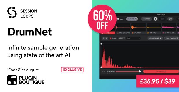 AIが無限にドラムサンプルを作り出してくれるドラムマシン・プラグイン『DrumNet』がサマーセールで60%OFFになっています。