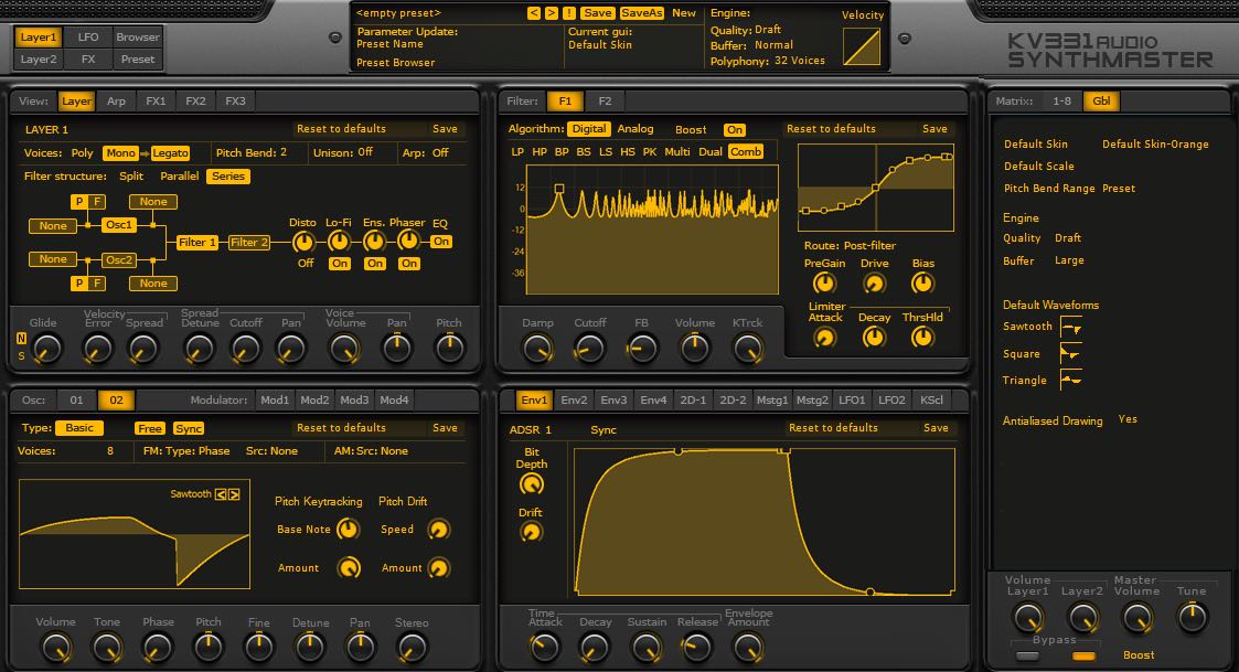 - 最大16レイヤー、各レイヤーに最大16モジュール(オシレーター、フィルター、エフェクトなど)と32のモジュレーションソース(エンベロープ、LFOなど)を設定可能。
