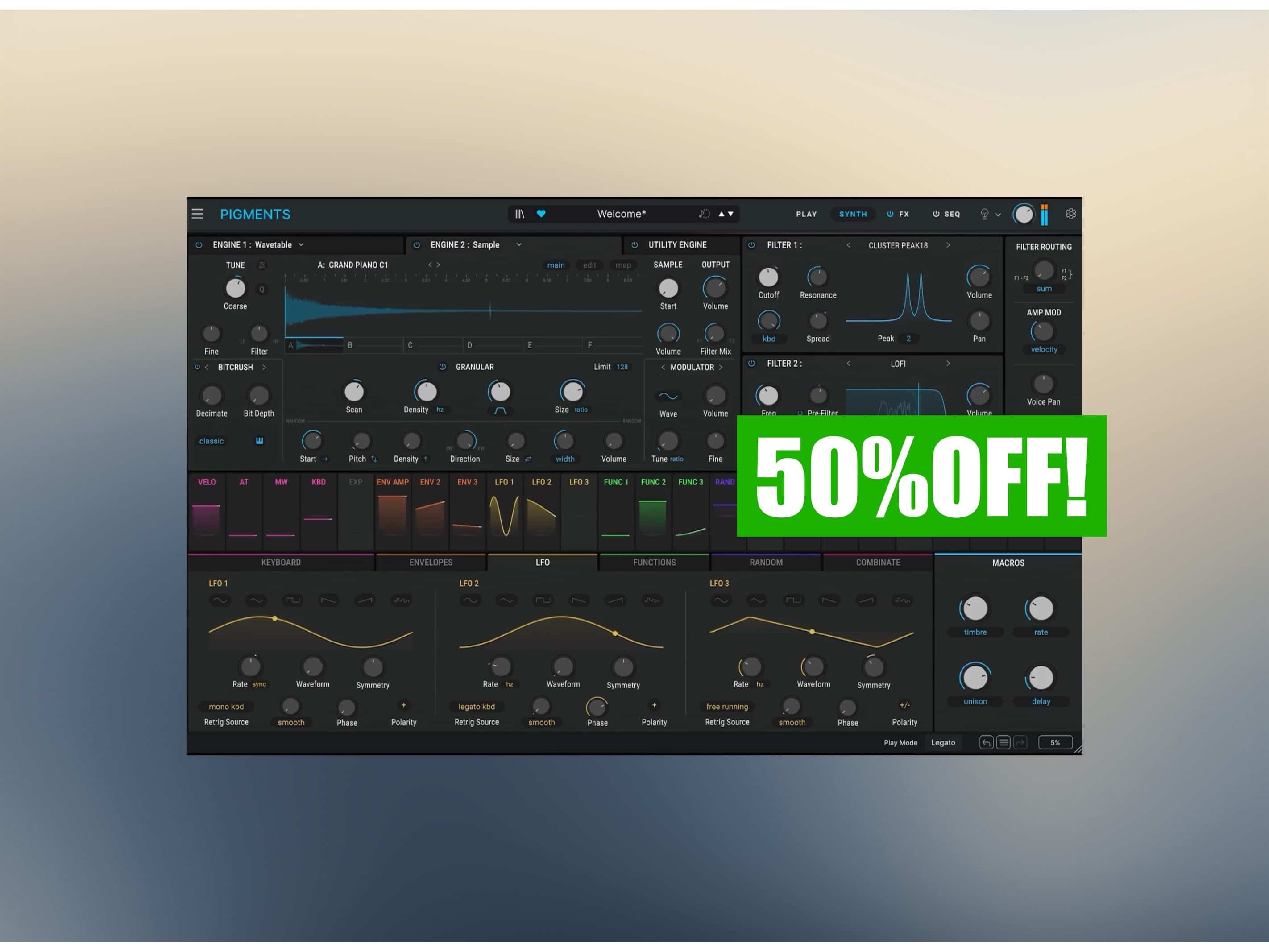 看板シンセ「Pigments」の最新バージョンの『Pigments 7』も半額になっています(最安タイです!)。