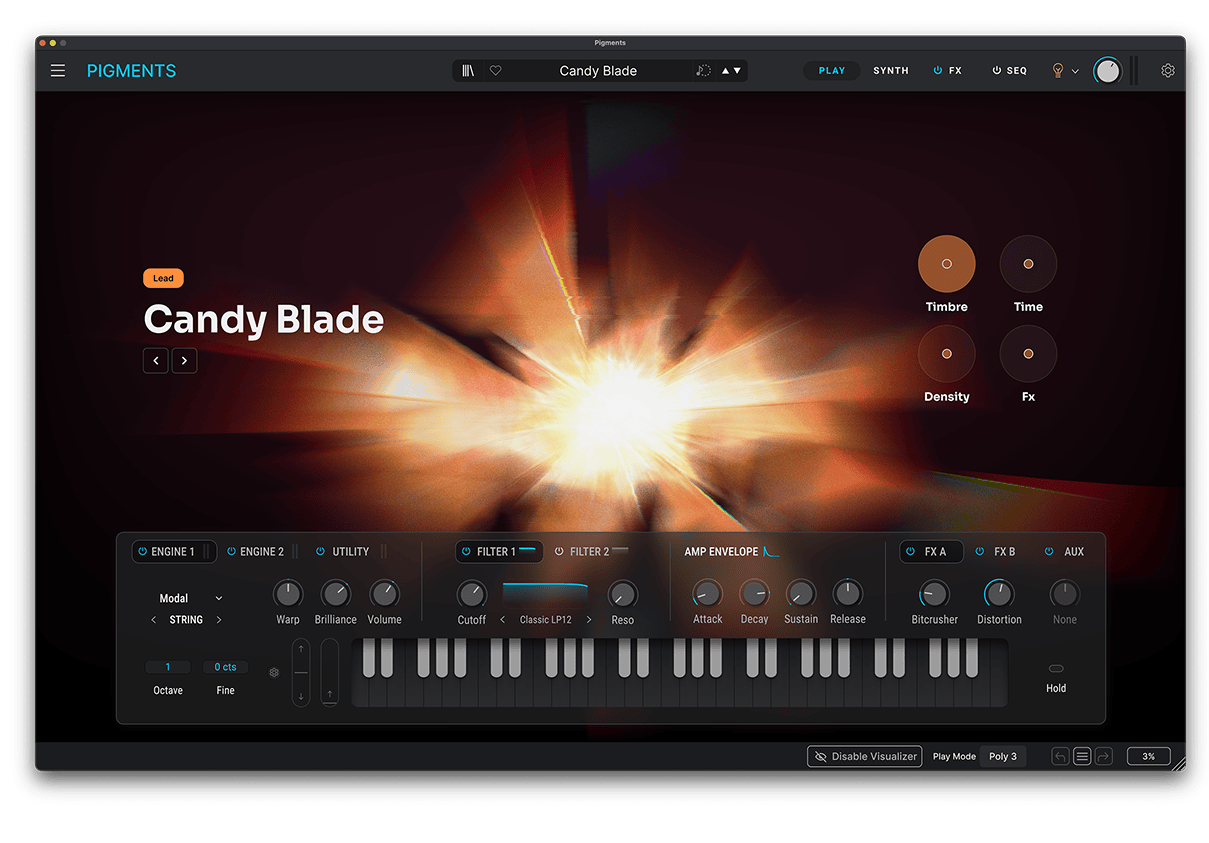 Pigmentsのマルチエンジン・アーキテクチャと奥深いモジュレーション機能で、無限の音色の可能性を探求できます。豊かなパッドや進化するテクスチャーから、鋭いベース、パンチの効いたリードまで、膨大なプリセットライブラリとマクロコントロールにより、複雑なサウンドもすぐに演奏可能で、簡単にカスタマイズできます。