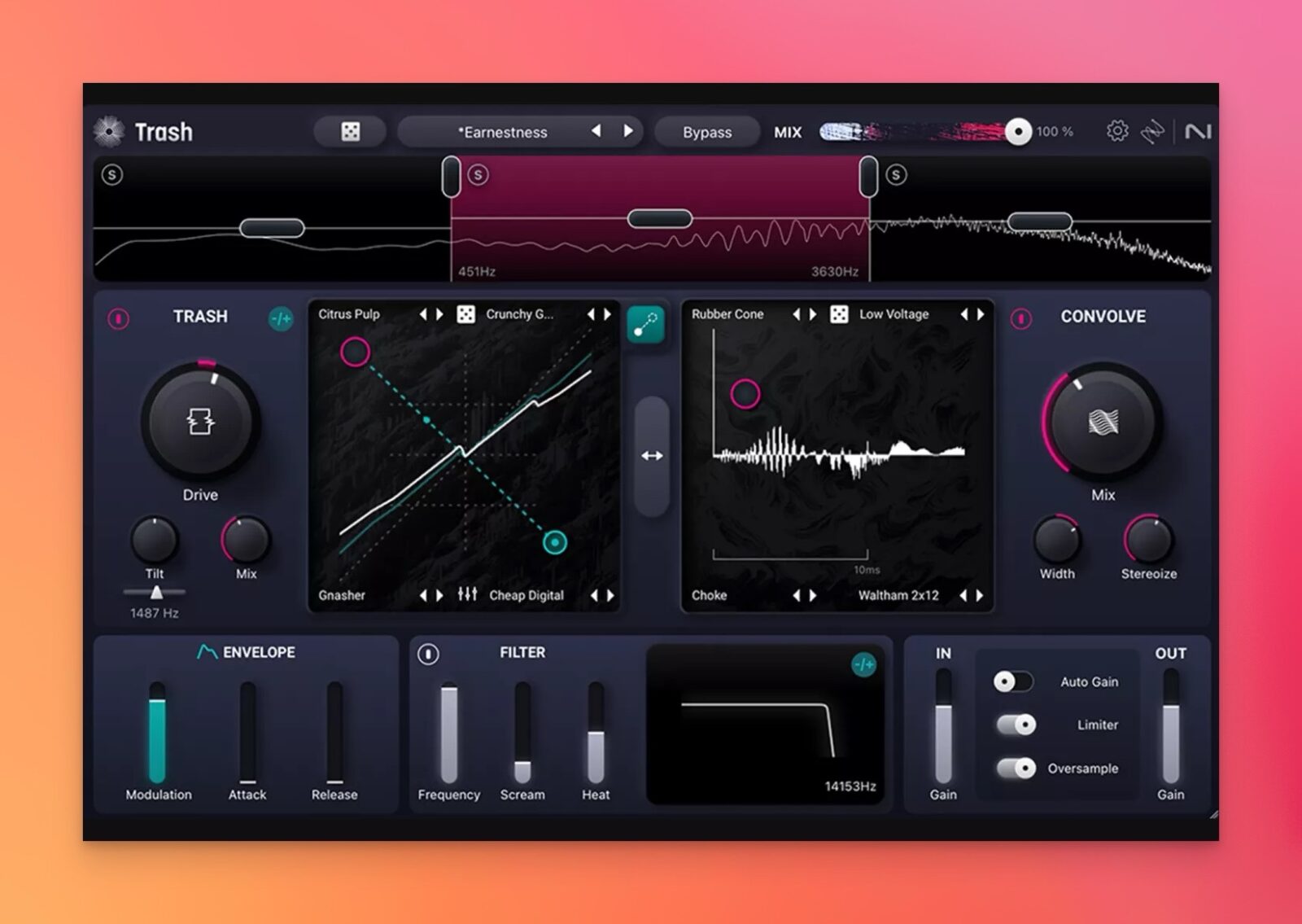 各周波数帯域のシグナル・チェーンでTrashモジュールとConvolveモジュールの順番を入れ替え、ディストーションと空間系エフェクトの無限の組み合わせを試すことができます。