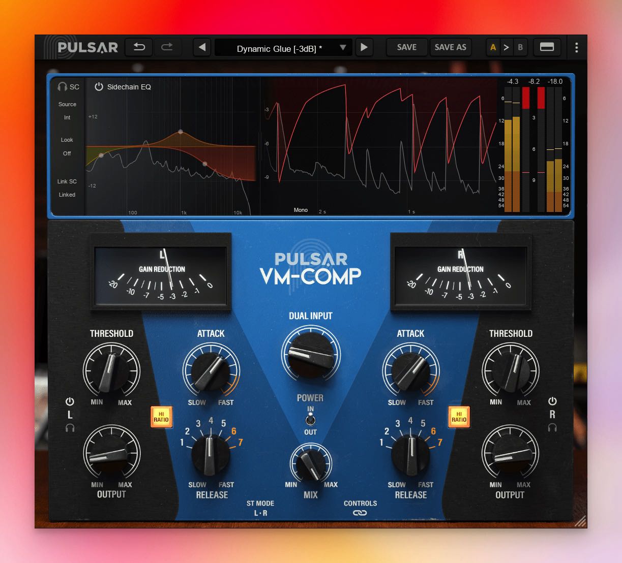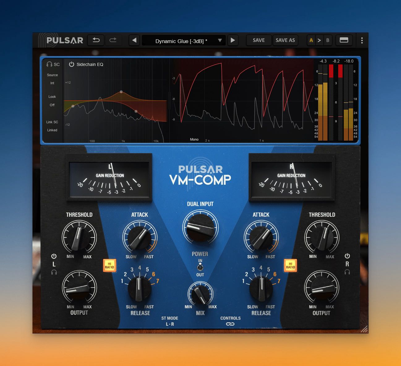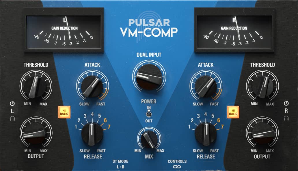 Pulsar VM-COMPはステレオコンプレッサーで、Left/RightまたはMid/Sideモードで動作します。ミキシングとマスタリングアプリケーションを想定して設計されていますが、トラッキングにも対応する柔軟性を備えています。