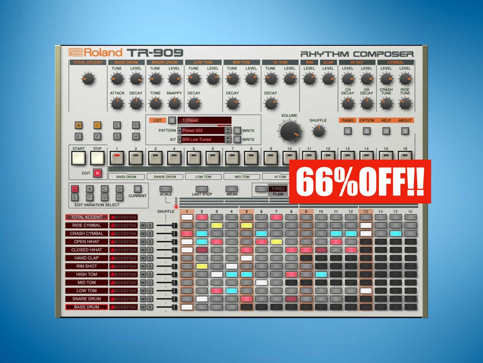 ドラムマシンの名機「TR-909」をローランド社本家がプラグインとして開発している『TR-909』が、909セールで超特価(66%OFF)になっています。