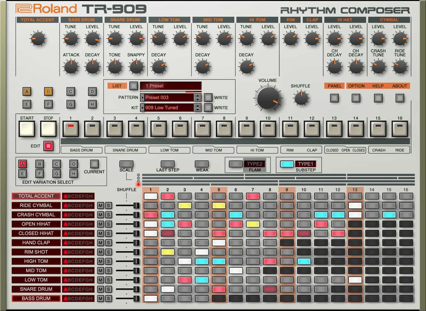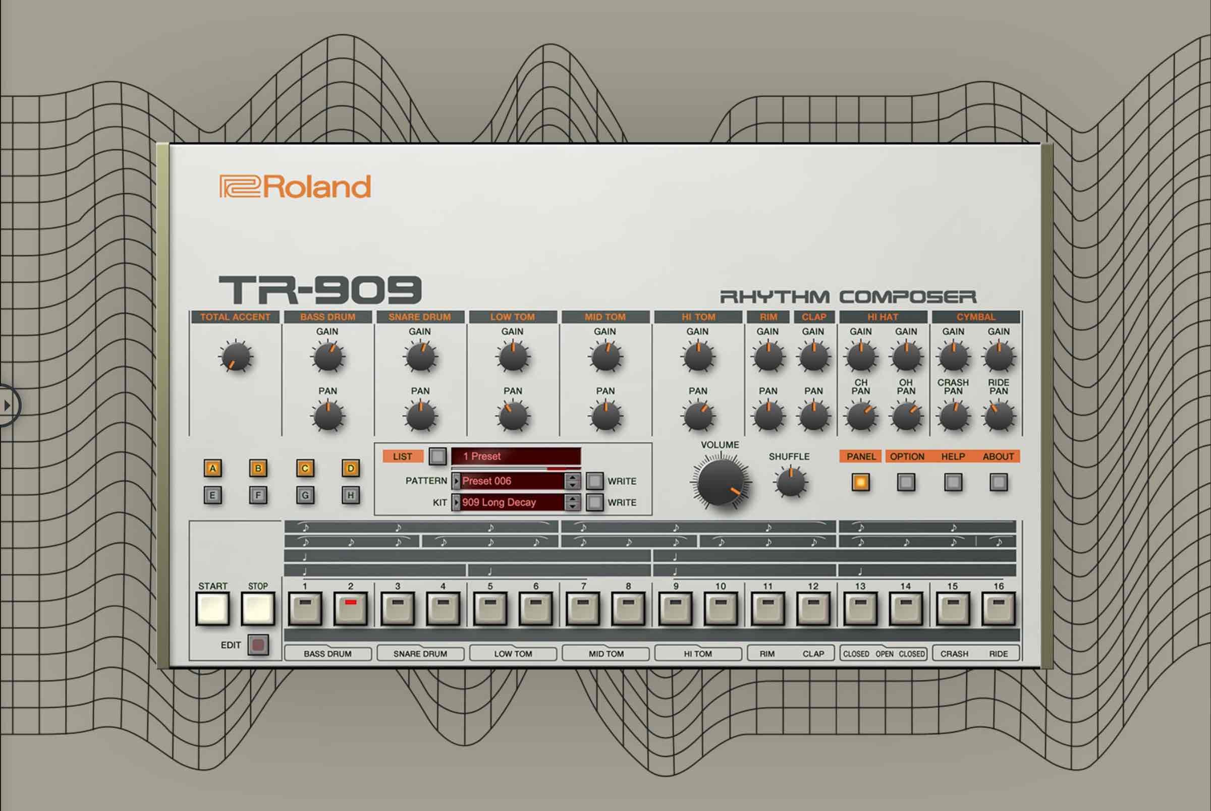 この909プラグイン・ソフトウェアは、スピーカーを屈伏させてしまうほどのオリジナル・モデルのパワーをそのままに、音響面での機能が向上し、プログラミングがより手早く、流動的にできるようになるなど、新たな機能を備えています。