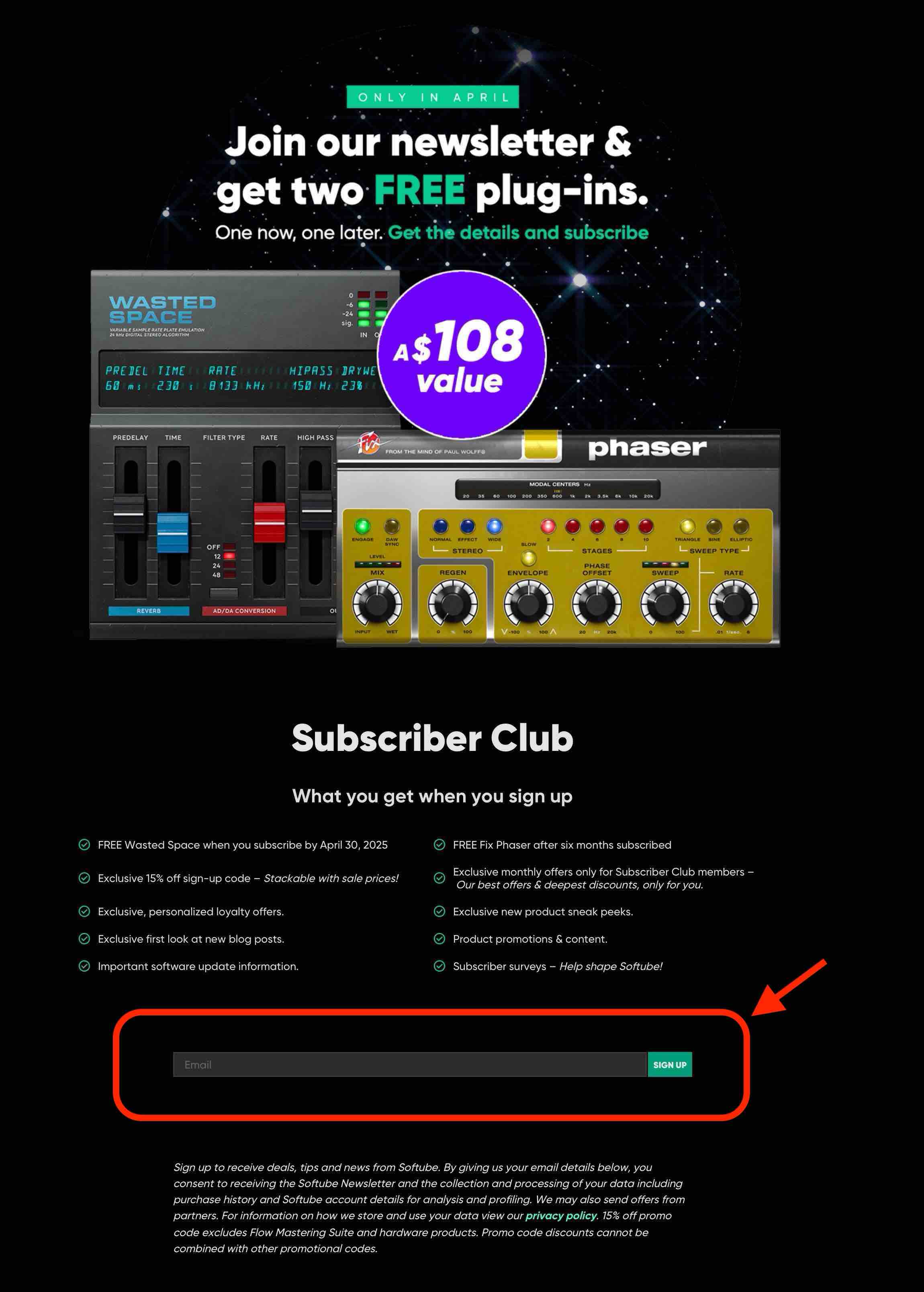 まだ、Softubeのニュースレター購読者クラブに加入していない方も、2025年4/30までに加入すれば、 Softube『Wasted Space』をもらうことができます。