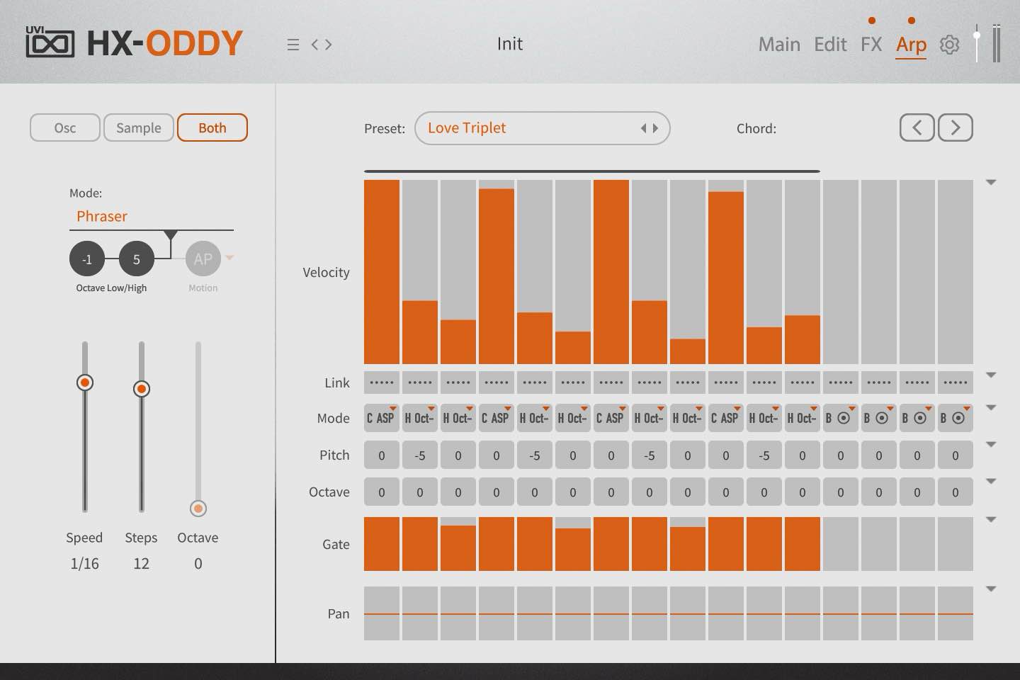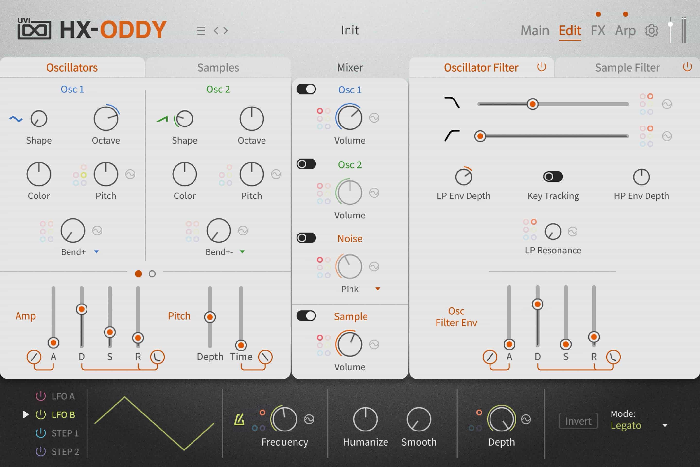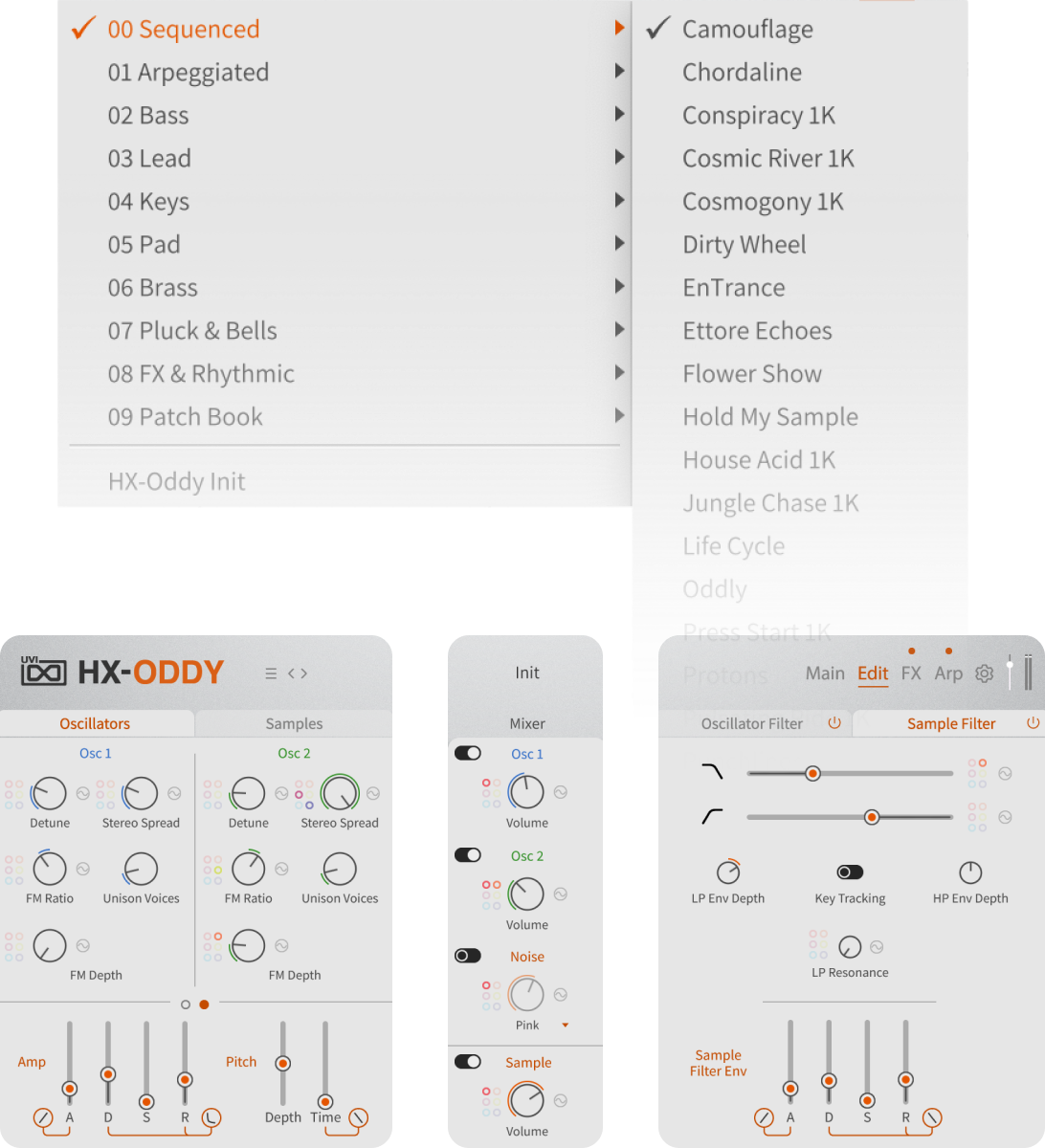 UVI『HX-ODDY』は、「2つのウェーブテーブルオシレーター」と「サンプルベースのレイヤー」の組み合わせと「物理モデリングフィルター」で多彩な音色を作り出すことができるシンセです。